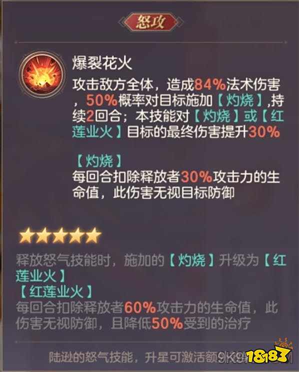 可以说是buff封神,最强应该不为过,5星陆逊就有直接让对面拉闸的输出,陆逊攻击越高,首先你直接造成的伤害就非常可观,其次是buff红莲业火,不仅输出高,还减疗,就算对面想防守反击,人都快被打没了,还拿什么反击?