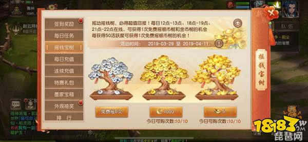 三颗摇钱宝树降临新服,玩家只要摇动宝树,即可获得银币、金币、道具或元宝奖励。银币树每日可通过在线和活跃度获得摇树次数;金币树每日可通过在线和购买获得摇树次数;元宝树每日可通过购买获得摇树次数。奖励价值必然高于购买价钱,稳赚不亏!