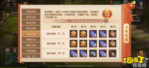 连续充值,多重返利!新服活动期间,连续1~5天,每日充值达到指定额度,可领取对应的充值返利奖励。更有绝版幻化武器、绝版坐骑:离火赤牛、绝版翅膀:堕天大放送!