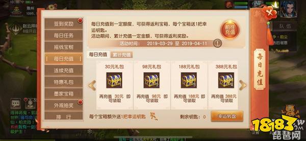 每日充值达到不同额度,即可获大量幸运宝箱,自由选择心仪的道具奖励。每个幸运宝箱还加送1把幸运钥匙,可从幸运转盘上抽取随机神将、木牛流马、乾坤风火轮、引魂笛、元宝在内的丰厚奖励。天选之人更有机会获得财神祝福,赢得双倍元宝道具奖励!