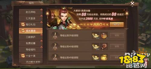 只需花费88元购买成长基金,即可畅享高达88倍的元宝返还和五连抽机会。等级越高返还越多,总共返还总价值6888元宝的元宝、珍品装备、金色宝物奖励!