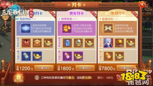 充值校尉月卡、将军月卡、都督月卡分别可领取#G1200、1800、7800元豪华礼包,金色装备、金色宝物等超强道具一步到位,9大顶级特权轻松暴虐土豪。