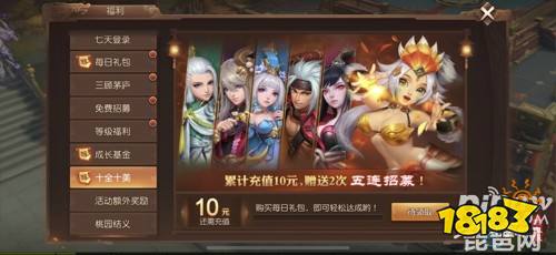 完成爵位任务即可免费获得解封神将魔·夏侯渊,充值1元即得最强辅助神将仙·吴国太,自动复活带无敌,更额外加送绝版超萌金将典满、宝石大礼包等豪华道具奖励。充值满10元即获赠10连招募武将机会,更有#G紫龙玉珏、秘宝钥匙、萌萌兔耳朵#l等价值300元大礼包等你来拿!