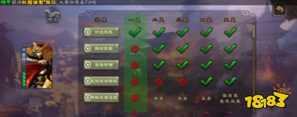 升阶之后可以获得扫光效果、酷炫技能、装备动画、龙形攻击特效以及特殊武将边框。武将阶位越高,就有越多的特效。