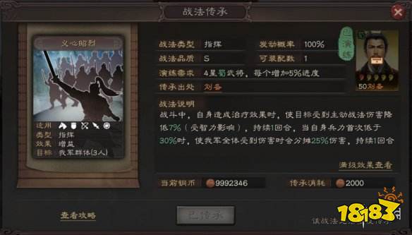 战法传承和品质有关,S级战法通过名将传承获得;A级战法需要指定的良将品质武将传承;B级战法需要指定的裨将品质武将传承。传承完成后可以演练相应战法,但是武将也会因此而消失。