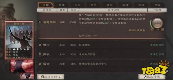 在游戏中总共有上百种的战法,打开战法界面我们可以查看到当前拥有的战法。而战法也分了7大类,分别是“指挥、主动、突击、被动、兵种、阵法、内政”。每一种类型都有不同的意义:
