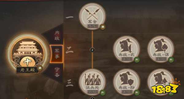 【兵战-防】【兵战-速】:君王殿3级解锁,升级可以提升部队中每个武将的防御和速度属性。