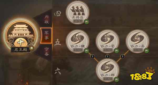 【兵战-武】【兵战-谋】:君王殿2级解锁,升级可以提升部队中每个武将的武力和谋略属性。