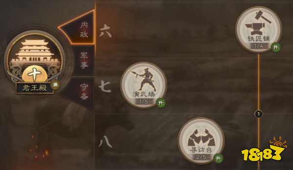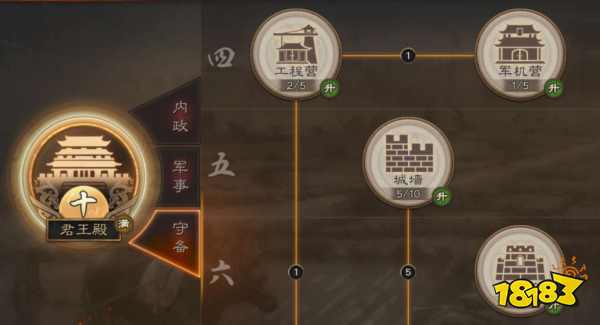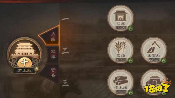 内政建设主公在进入城池后点击“城建”可以打开城建操作界面。城建的主体是“君王殿”,其次分了三个种类的建设,分别是:内政建设、军事建设、守备建设。内政建设可以提升主公的发展和资源产量。