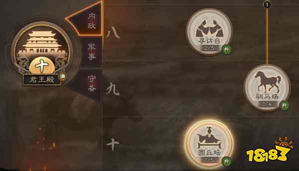 【圆丘坛】:在君王殿10级时解锁,升级可以提升主公的名声值上限,提升名声可以提升主公的领地上限。