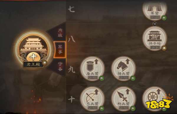 【军营】:君王殿7级解锁,升级可以增加本城武将的带兵上限,让武将兵力得到大幅提升。