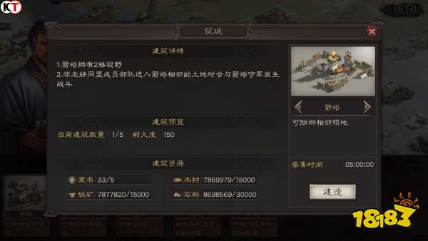 在名声达到5000后,占领一块土地后就可以进行筑城操作,部分建筑会消耗策书。同时高级建筑有总量上限,超过后将不能再进行建造。箭塔
