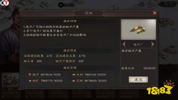 造币厂可按比例提升玩家的铜币产量,多个造币厂的效果可叠加,税赋的铜币数量也会受到造币厂加成的影响。建造消耗铜币、木材、铁矿和石料。造币厂可在部分6级或以上资源地建造。升级造币厂可以提升耐久度和铜币产量。工坊