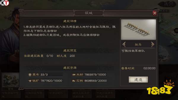 拒马可用来阻挡敌军部队。非友好同盟成员部队进入拒马所在的土地时会被拒马阻挡。阻挡状态下部队无法移动。消耗3本策书以及木材、铁矿、石料资源。升级工事营可提升建造数量级等级上限,升级拒马可提升耐久。拒马和箭塔配合可有效阻挡敌军。营帐