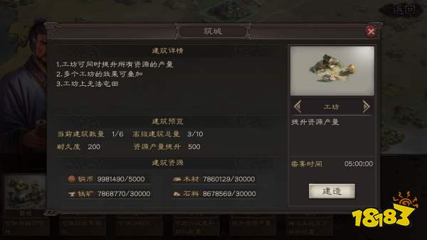 工坊可同时提升所有资源的产量,多个工坊效果可叠加,工坊上无法屯田。工坊可在部分6级或以上资源地建造,升级工坊可提升耐久度和资源产量。建造消耗铜币、木材、铁矿和石料。分城