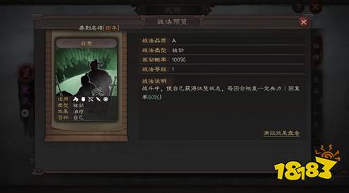 在游戏中是A级战法,每回合可以恢复一定的兵力,满级的回复率为100%。该战法目前只有通过拆解董袭获得,然后再使用7名紫将演练到100%就可以使用。