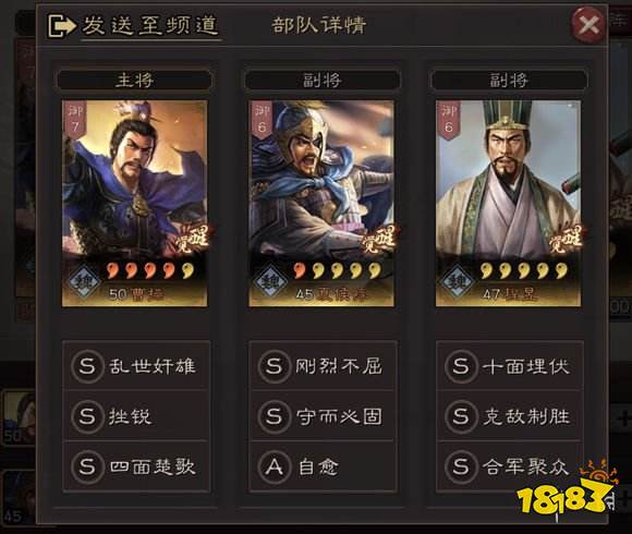 而至于曹操为什么不带舌战群枪,是因为在这个阵容里三个人都要打输出,否则群嘲到弯弓饮羽或者夏侯渊就会导致关键技能十面埋伏无法释放。带自愈和合军聚众则是由于曹操又肉又能回血,先死的一定是两个副将。而回血技能在一定程度上就是最强的加攻击力技能!因为攻击力是与兵力相关的,活着才有输出,保持优秀的兵力才有输出。