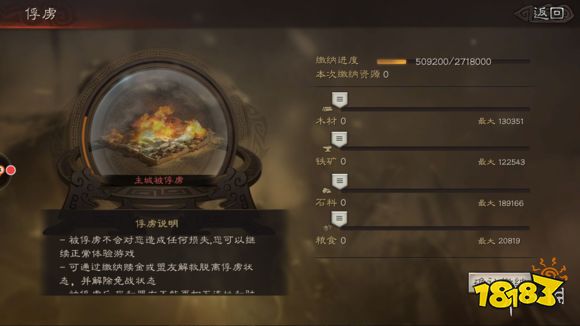 玩家被俘虏后,左下角将会有一个被俘的按钮,点击进入就能进行缴纳资源操作。
