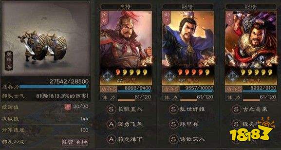 张飞:一定要绑定盛气凌敌,如果情况允许关羽和张飞尽量绑定一起,当关羽的威震华夏触发缴械的时候,张飞的燕人咆哮可以降低目标50%统率,形成联动。