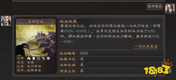 普通攻击之后,对攻击目标再次发起一次兵刃攻击(伤害率102% → 204%),自身为主将且当目标兵力低于50%时,额外提高伤害(受目标损夫兵力影响,最多提高25% → 50%)