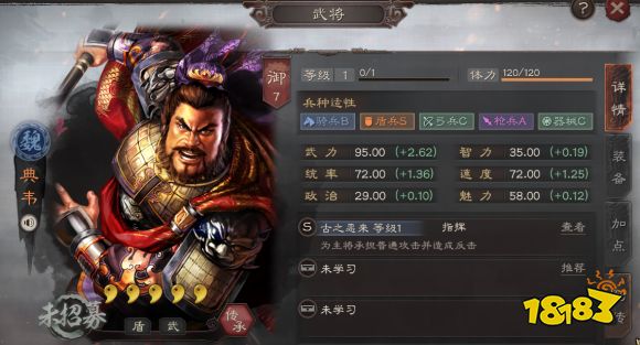 因此,我们可以简单对典韦的属性分析得到,典韦拥有优秀的武力成长,一般的统率强度,以及极其差劲的智商。从属性上属于进攻手。