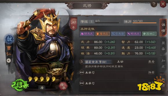 武力1.26,统率2.31,智力1.02,结合前面几个武将的三围说明,相信大家都看出来了,这是一个标准坦克模板,输出堪忧坦度合适。速度0.43且初始只有23,巨慢,无法作为先手控。