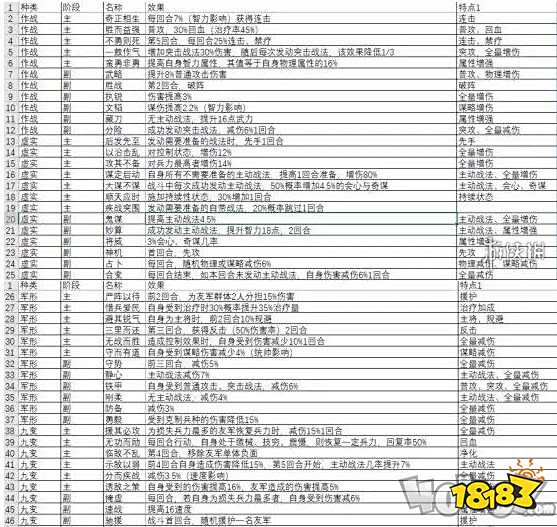 经过对绝大部分主力武将的梳理汇总,目前整理出来作战系5主6副、虚实系7主6副,军形系6主6副,九变系6主7副,难免遗漏,欢迎批评指正。