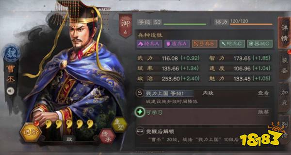 曹丕在游戏中还是相当强力的,技能为戳力上国,这个内政战法的效果是曹丕为主政官时,建城的升级时间降低,这个要曹丕为主政官时效果才有哦,满级战法可以减少30%还是相当多的,他也是游戏里唯一一个可以减少建筑升级时间的角色。