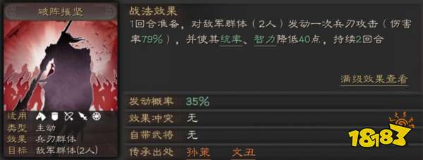 曹彰的主动战法叫做挫志怒袭,需要一回合的准备时间,然后对敌人的两个武将施加虚弱效果持续一个回合,如果对方已经是虚弱那么就会变为猛击,这个战法的发动率不高,升到慢也只有35%的几率,搭配挫志怒袭、神上使、白眉这些战法还是比较强力的,如何你不喜欢还可以带轻勇飞燕、奋发等其他战法,这里并没有明确的规定,大家喜欢什么带什么就行。