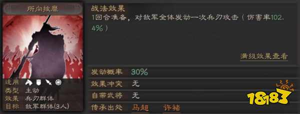 所向披靡可以从马超和许诸两位武将那里获得,效果为先准备一回合,然后对敌人全体发动兵刃攻击。虽然发动几率不高只有30%,但是一旦发动造成的伤害是不容忽视的,除了弓兵都可以带这个战法。建议搭配的武将有关羽、甘宁、赵云,这三位武将本身就有很不错的输出,如果搭配了这个战法可以打出不错的爆发伤害,大家可以去尝试一下哦。