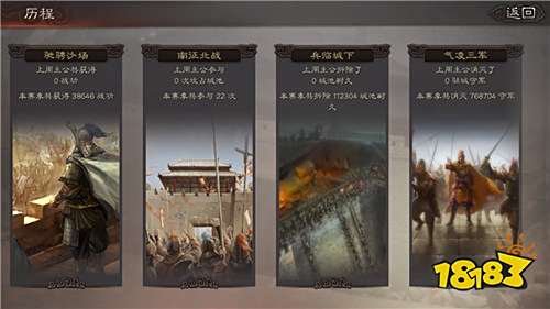 在历程中一共有5项数据可以查看,分别是驰骋沙场、南征北战、兵临天下、气凌三军和拔旗易帜。主要记录了玩家在赛季中的战功数量、攻占城池数量、拆除城池耐久、消灭城池守军以及攻占其他玩家领土。