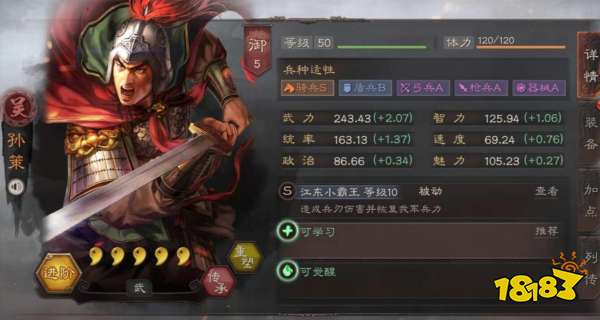 孙策的定位是一名势力非常强悍的输出型武将,因此孙策的武力有着非常强的成长,而且孙策的统御值非常的低,这就使得孙策是一位非常强大的开荒武将。孙策的打法思路主要是使用自身的战法频繁发动造成高额的输出,因此在孙策的兵种适性上有一种S级和三种A级兵种可以带出,但不现实兵种,所以孙策被誉为在前期的开荒“神将”。