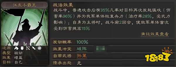 孙策的自身战法是江东小霸王,这个战法可以发动一次二次攻击并且还能恢复自身的兵力,有着一定的自我恢复能力,十分的强大。因此战法,孙策在成为主将的时候还能够承担一部分的辅助效果。