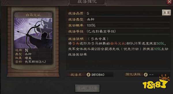 在游戏中,白马从义是弓兵进阶而来,主要是用的是公孙瓒的子弹战法和传承战法,效果为部队的行军速度增加50%,获得两个回合的先攻权力,并且提高主动战法的触发概率10%,对于一款先下手为强的游戏来说,白马从义所获得的两回合先手非常的关键,再就是白马从义的机动性和射程非常的远,使得这是部队有着远超弓兵的战斗力。