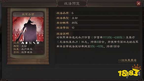 对敌军单体造成兵刃伤害(伤害率117.5% → 235%)及禁疗(无法恢复兵力)状态,持续3回合,并使有负面状态的友军单体自带战法发动率提高5% → 10%, 持续1回合。
