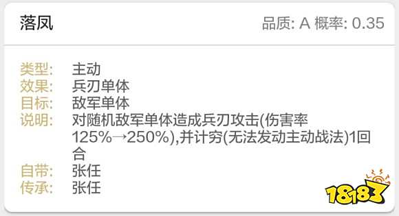 35%瞬发常规。效果是对敌军单体造成250%伤害!要知道这个伤害虽然比起骁勇善战等伤害不高,但是这是一个瞬发战法!发动期望要高得多;纵使对比轻勇飞燕,这个战法的好处就是伤害非常稳定,只要发出就有250%的伤害。可能有人会觉得轻勇飞燕只有33%的概率伤害会比落凤低,但是有两点:第一,轻勇飞燕毕竟还是一个看脸战法,在非酋的时候就不是按这个算法了;而且最重要的是,落凤是瞄准一个人打的!它不会出现像轻勇飞燕一样雨露均沾的问题。而最后一点,也就是落凤的第二个效果,那就是一回合计穷!到这就不难看出这个战法更适合打法师。首先是计穷,对法师更加有效就不解释了;而且法师的法抗也是很高的,不惧怕谋略伤害;但是也是为了平衡法师和战士的属性吧,法师普遍比战士的统率要低一点。