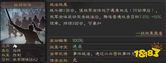 (骑兵专用)战斗前2回合,使敌军全体处于遇袭状态(行动滞后),我军全体发动突击战法后,降低普通攻击目标15%的统率,持续三回合,可叠加。