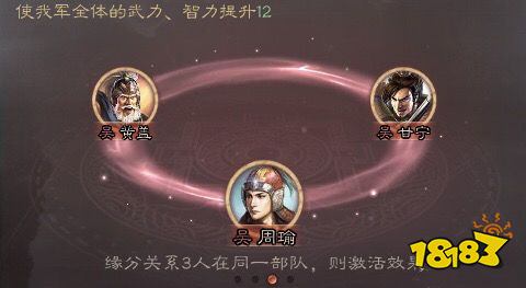 赤壁队由东吴的周瑜、甘宁、黄盖组成,三人组合可以获得缘分加成。(我军全体武力、智力提升12)