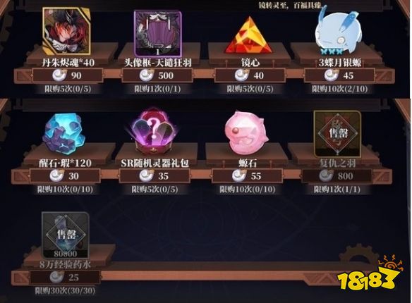 丹朱5个需要450贝,头像框需要500贝,镜心需要200贝,三碟月银螈10个需要450贝,醒石1200需要300贝,5个SR礼包需要175贝,螈石550需要100贝,240w经验需要750贝,复仇之羽称号800。