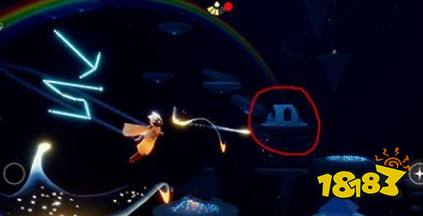 玩家想要得到禁阁彩虹蜡烛需要飞到禁阁的第四层,然后在这个平台上就可以看到一个非常大的彩虹,非常唯美。这个时候玩家直接飞到彩虹桥的右边,可以仔细的观察一下图中的标注这里。然后在这个亭子里面,就可以看到一团蜡烛,直接靠近,就可以顺利的收集。这个时候屏幕就会弹出来彩虹蜡烛已经收集得到了。所以大家想要收集这个彩虹蜡烛,就直接来到这个第四层即可,其实这个是有规律的,一般都是在彩虹桥下面就可以找到。