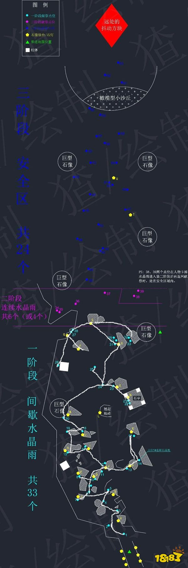 伊甸红石雨,这里是重点,很多人对于红石雨是感到恐慌和迷茫的,拿到下面那张图也不知道该怎么办,其实一二阶段都是很简单的。一,首先你要确保自己先点着身边的一个烛台,如果你在后面被砸中快速返回离你最近的烛台,二,你要在烛台旁观察落石的规律,其实也就两种,一种是间接性的左边地图右边地图循环落石,一种是从远到近的落石,只要掌握规律一二阶段就没啥了,三,神坛点一下就行不用等动画出来再走,这个技巧可以保证你在第三阶段能点到更多神坛