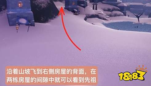 3、沿着山坡飞到右边房子后面,在两栋房子中间找到熊抱雪人先祖;
