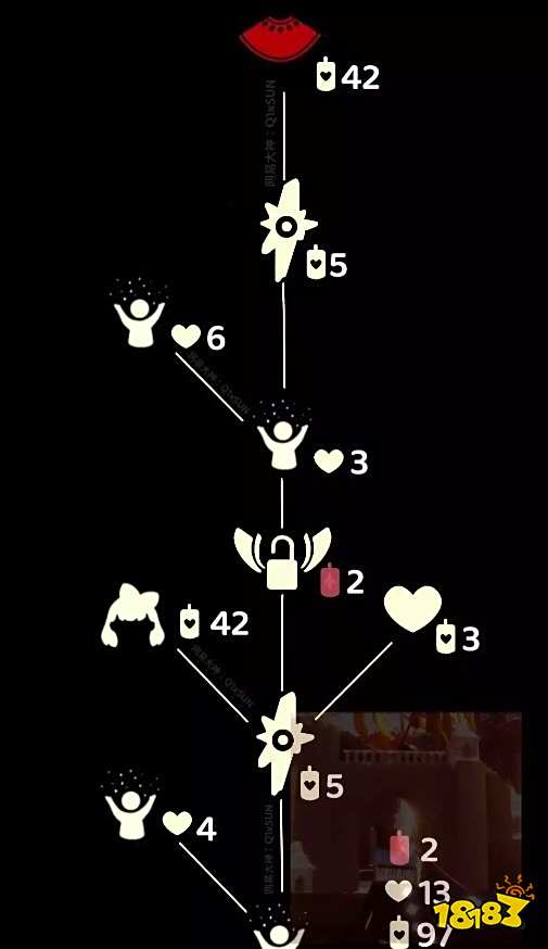 斗篷需要60根蜡烛。 但是要解锁到斗篷,需要一个永久光之翼,一个3级动作,2个前置魔法节点(兑换图里的乐谱画错了,其实是一个魔法节点), 所以,斗篷到手,需要合计70蜡烛;2根升华蜡烛,3颗爱心;
