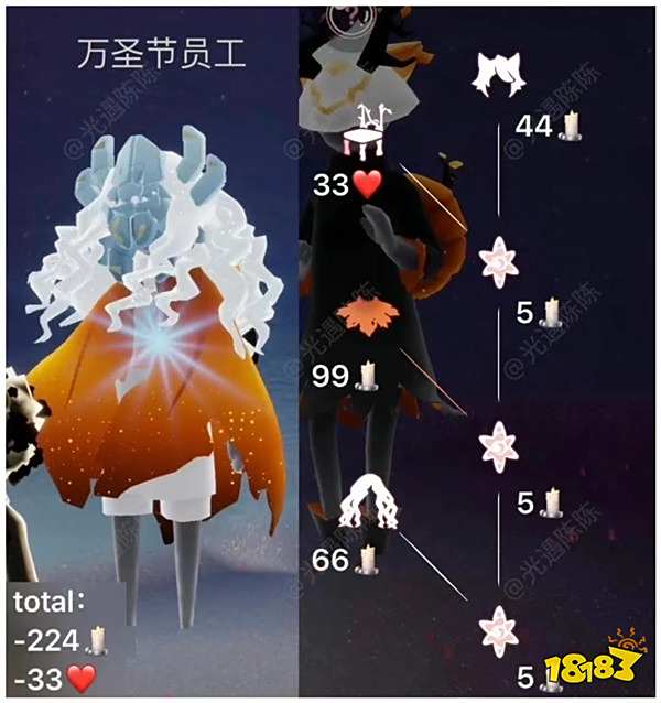 3、光遇万圣节2022兑换图需要玩家花费224根蜡烛和33颗爱心,具体的开销可以参考下文: