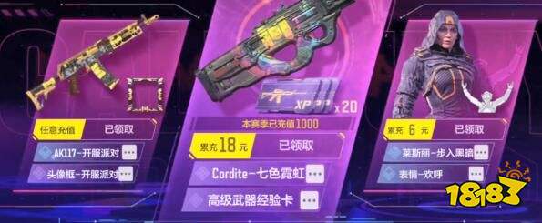 3、首充18元获得Cordite七色霓虹皮肤+高级武器经验卡。