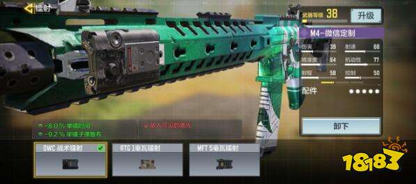 镭射:OWC镭射,使用M4我们主打的肯定是中近距离的作战,使用OWC镭射可以提高开镜速度以及部分稳定性,对于新手来说增加了稳定性就更加容易上手了。