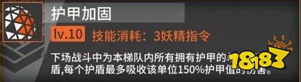 护盾加固(指令消耗: 3) :下场战斗中为本梯队内所有拥有护甲的单位张开护盾,每个护盾最多吸收该单位60% ( 150% )护甲值的伤害。