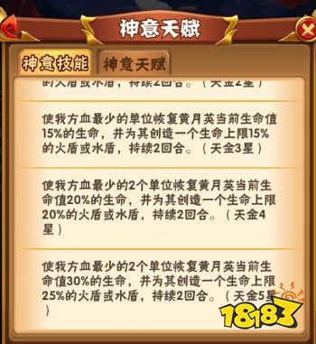 金将1星后会开启神意技能和神意天赋,月英的神意技能是给我方单位治疗和附加水盾或者火盾。