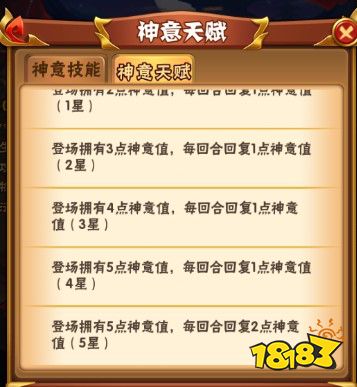 关于神意技能,金将2星可以登场第一回合释放技能,4星可以在前两回合连续释放神意技能。