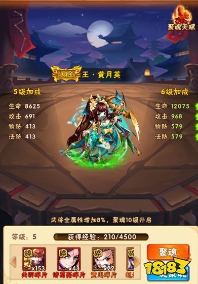 金将聚魂,消耗本国的武将碎片可以对天金进行聚魂,橙色碎片可以涨7点经验,红色碎片可以涨10点经验,每升10阶段可以增加百分比属性。聚魂满级为 30级,会消耗掉不少碎片。